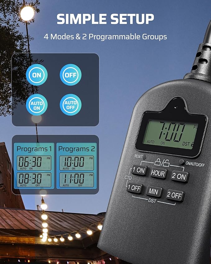 - [Three Timing Modes] Control your outdoor devices with flexible schedules: Always On, Always Off, or Timer, with daily repeat options; the minimum time interval is just 1 minute, offering precise control for holiday lights, string lights, garden decorations, or pool pumps and fountains